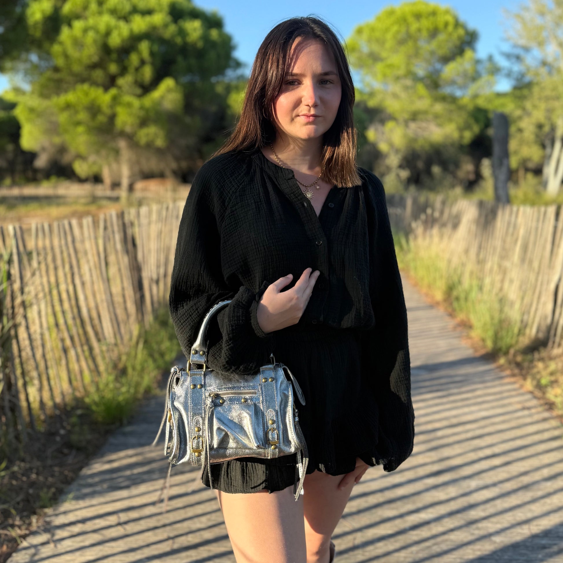 Le sac Gloria en petit format, mesurant 24 cm de large, est idéal pour un usage plus léger et quotidien. Fabriqué en cuir irisé et en Italie, il conserve le même design élégant et artisanal, parfait pour compléter votre tenue avec style tout en offrant la praticité nécessaire pour transporter vos essentiels.