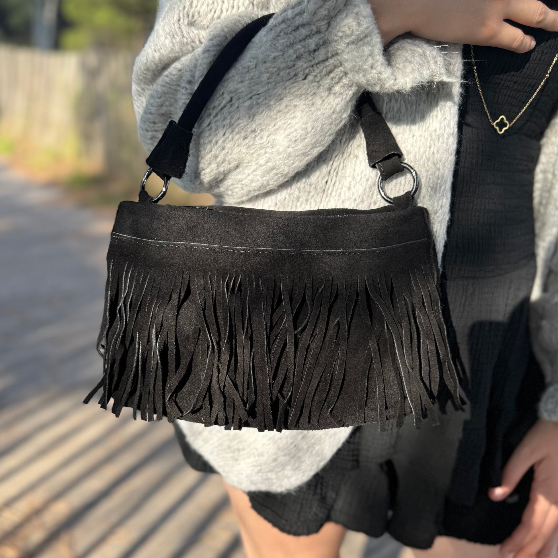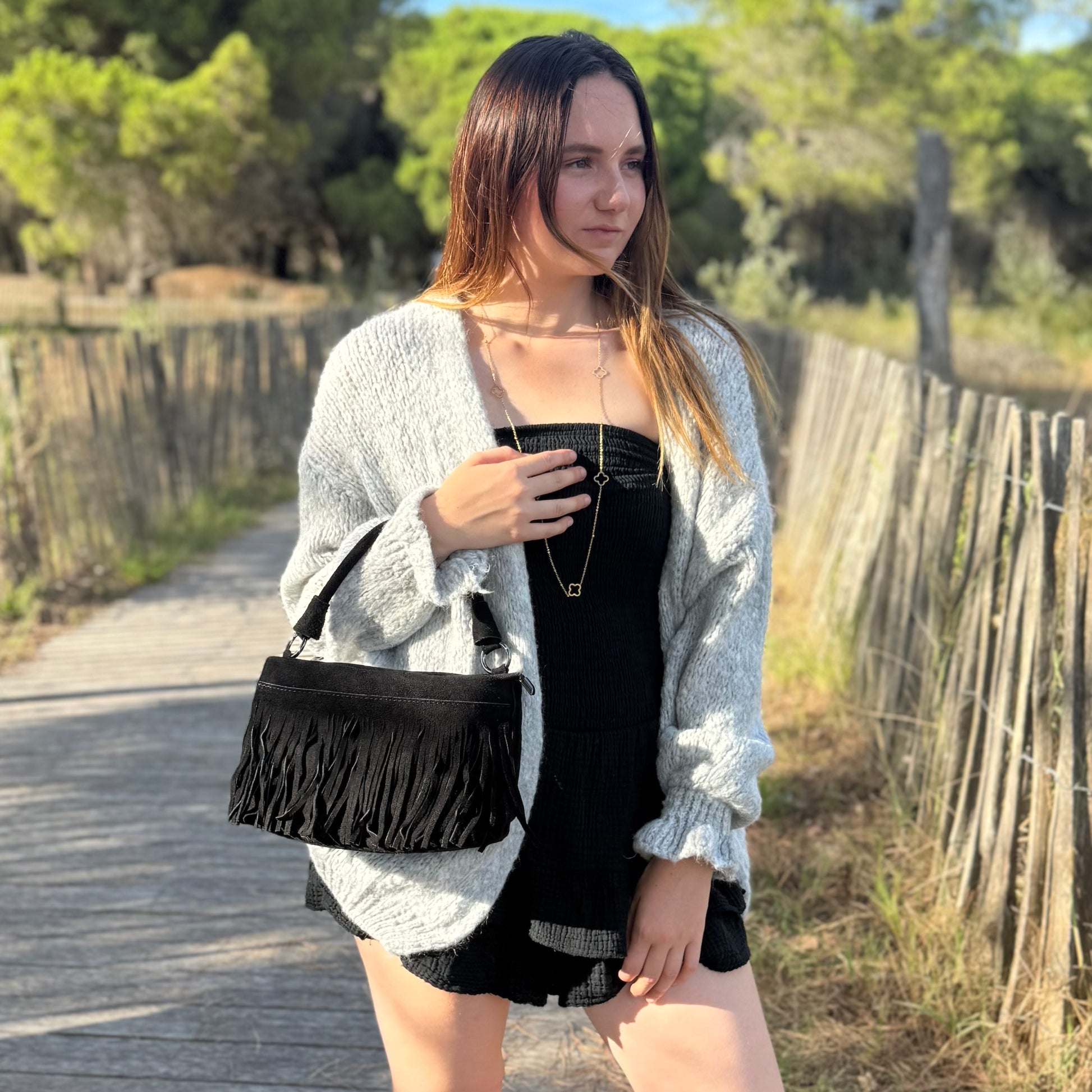 - Sac à épaule en daim, détail franges, fermé par fermeture éclaire, bandoulière amovible inclus , poche à l'intérieur